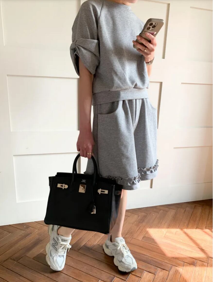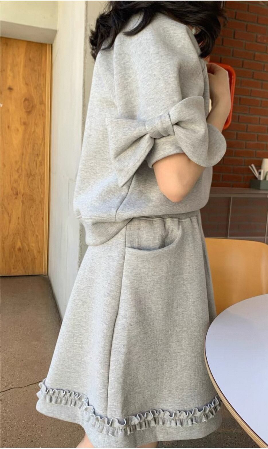 カジュアルでありながらキュートな印象を与える、リボン付きスウェットとフリルショートパンツの