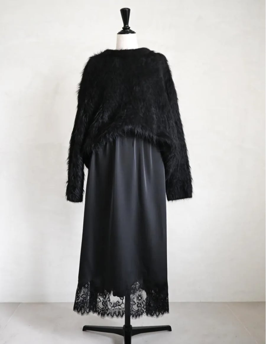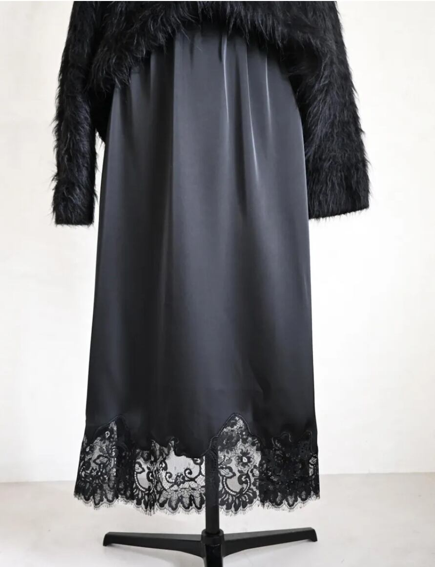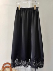 柔らかなサテン生地に繊細なレースがあしらわれたスカートは、シンプルながらも特別感を演出します♪