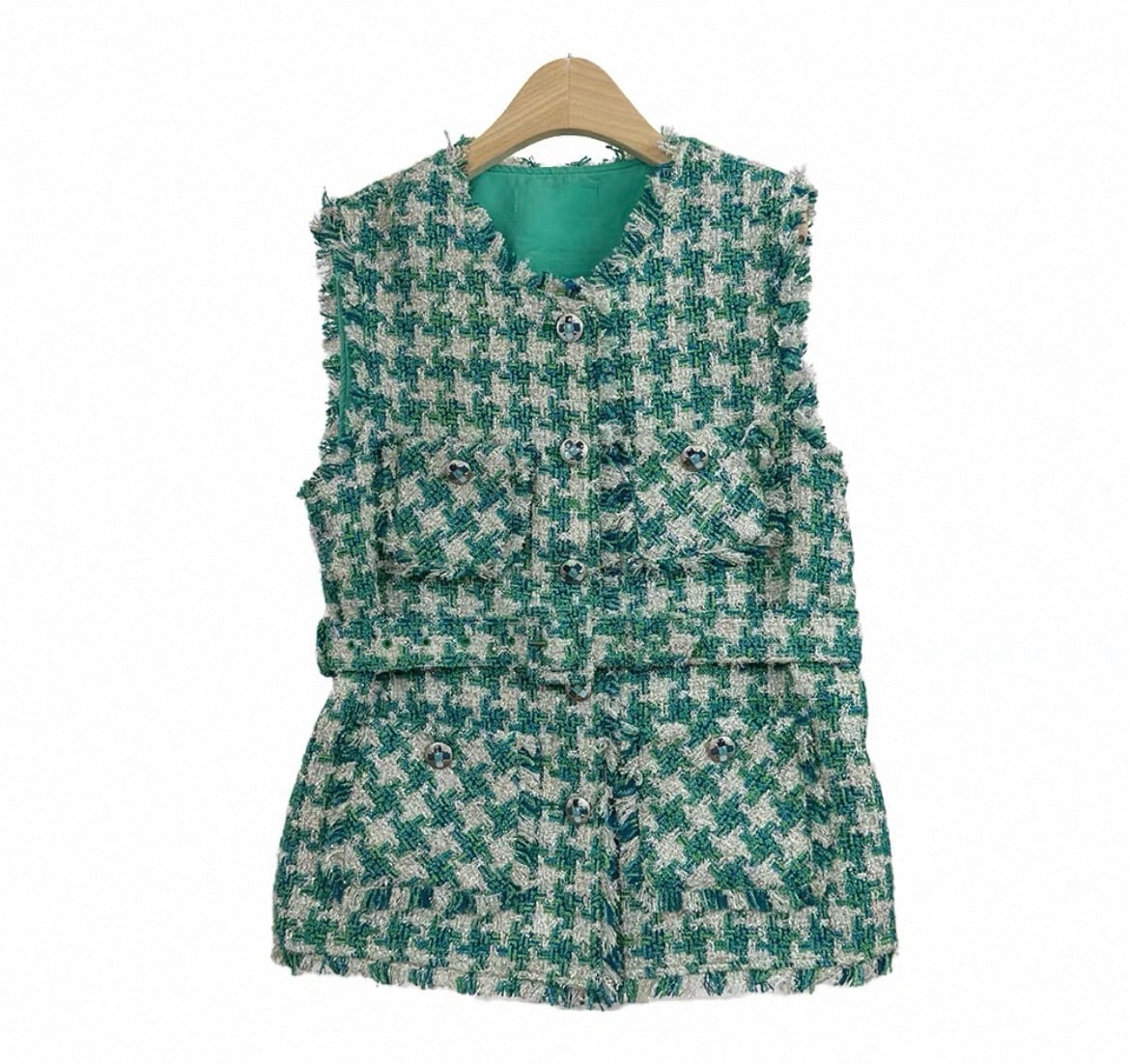 グリーン千鳥カラーがかわいいベルト付きツィードベストです♪