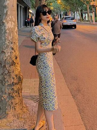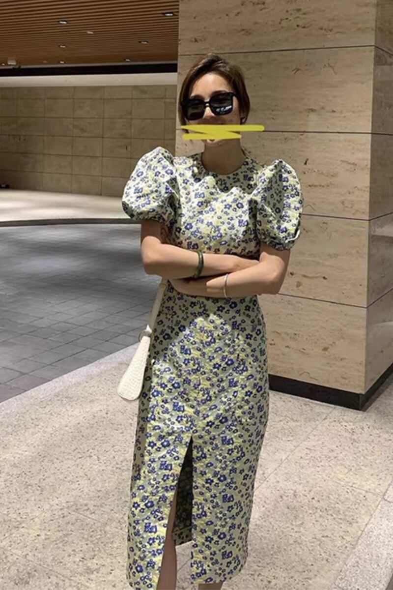 小花柄のレトロなパフスリーブワンピースです♪
